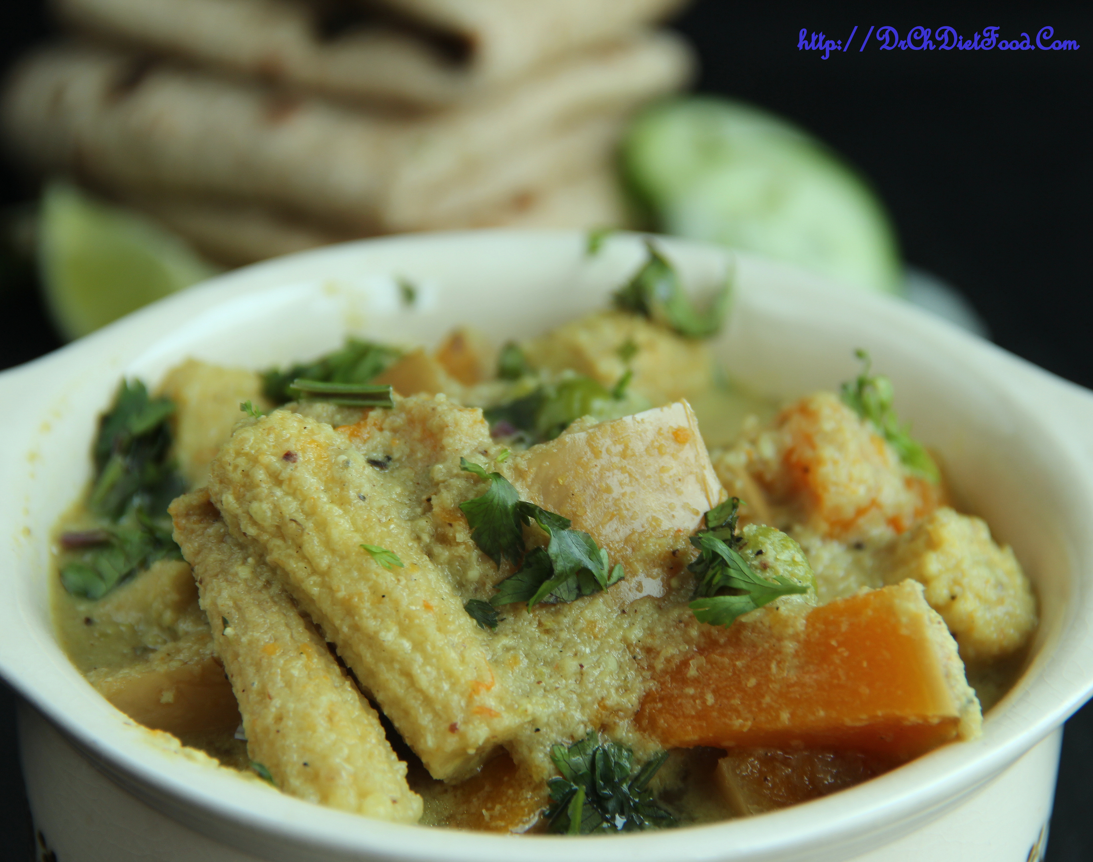 A creamy Indian korma that combines ground whole spices with succulent squash/pumpkin and baby corn cooked in coconut milk.